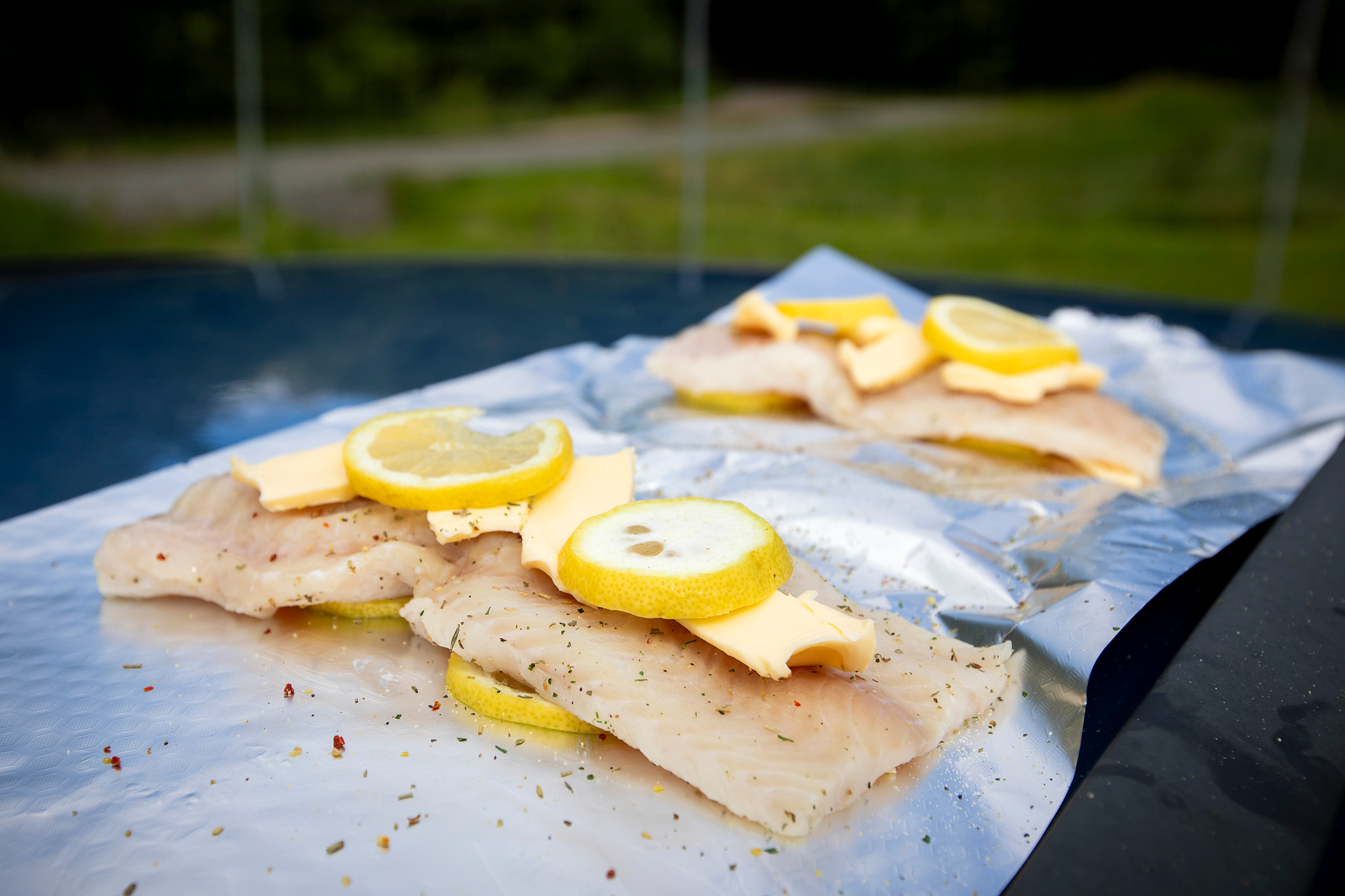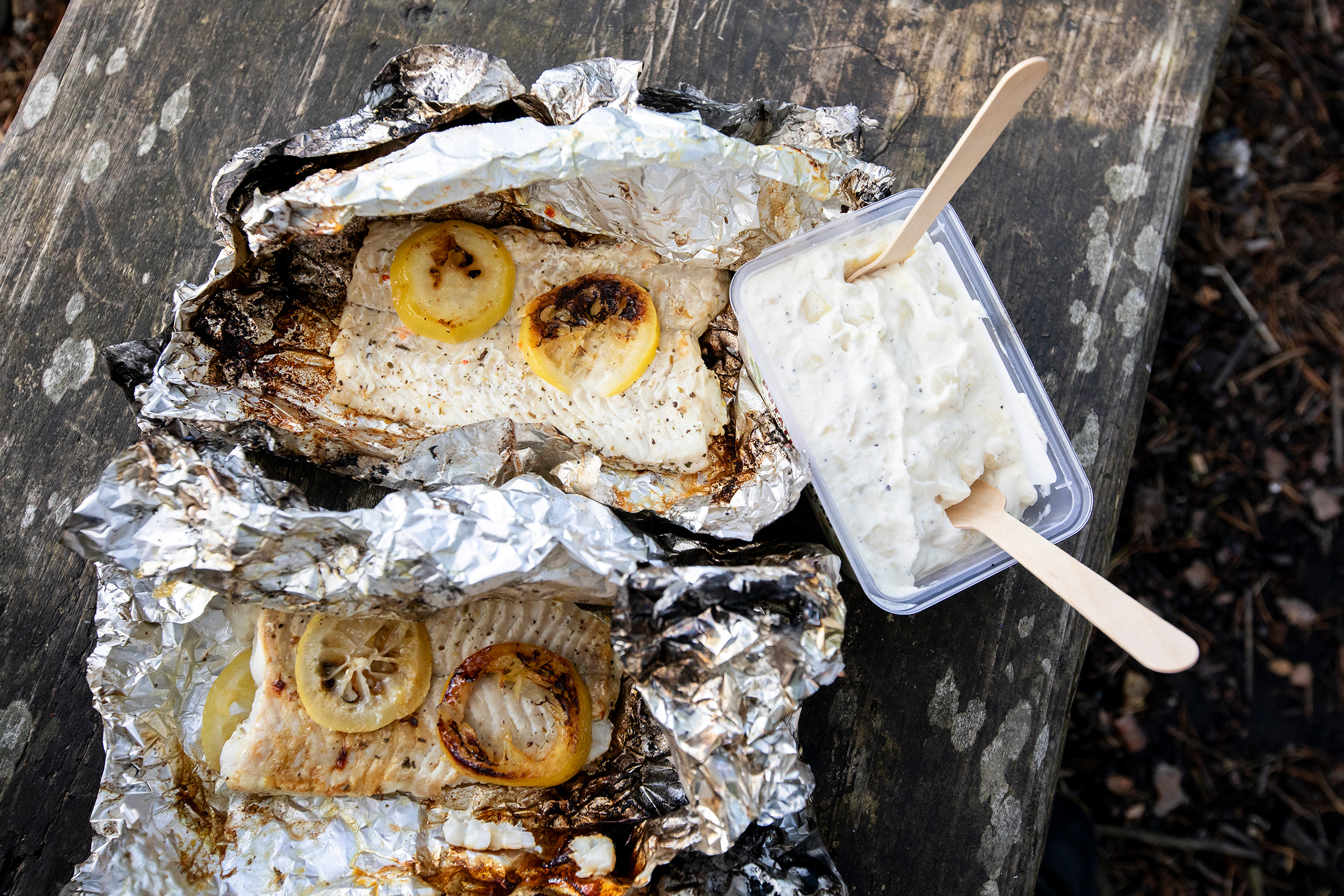 Prepared it on top of the car before heading out. Just some herb salt, butter and some slices of lemon. Wrapping it in aluminium foil and ready for the fire.